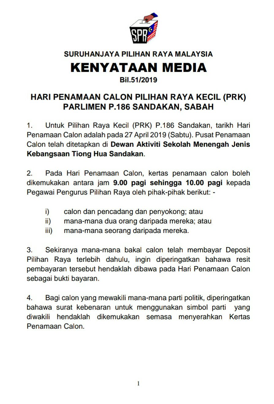 Hari ini, proses penamaan calon bagi pilihan raya kecil (prk) parlimen sandakan di sabah diadakan di dewan aktiviti sekolah.