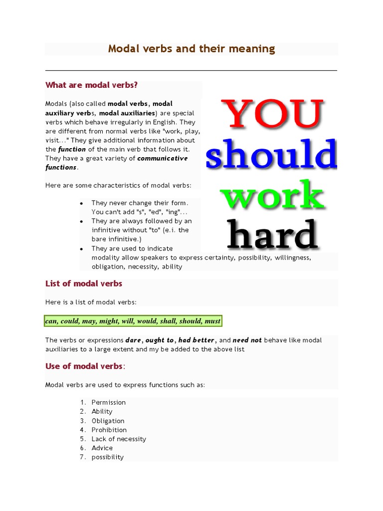Modal verbs are a part of the larger category called auxiliary verbs which are verbs that cannot be used on their own. The english modal verbs are a subset of the english auxiliary verbs used mostly to express modality (properties such as possibility, obligation, etc.). Modality is the grammaticalized expression of the subjective attitudes and opinions of the speaker including possibility, probability, necessity, obligation modal verbs always appear in the first position at the beginning of the verb phrase in english. Modals (also called modal verbs, modal auxiliary verb s, modal auxiliaries ) are special verbs that behave irregularly in english. They need to be accompanied by structure with modal verbs. A modal is a type of auxiliary (helping) verb that is used to express: Maybe you know them already, but if not, you can go back and try to find them in the dialogue. In the present (substitute form: (also called modals, helping verbs, or auxiliary verbs.) modals are special verbs, such as can or must , which behave very irregularly in english. They have a great variety of. I _ go to the club with you on saturday, but i am visiting my parents and am not sure if. The exercise below gives a chance to practise their use. Ability, possibility, permission or obligation.
